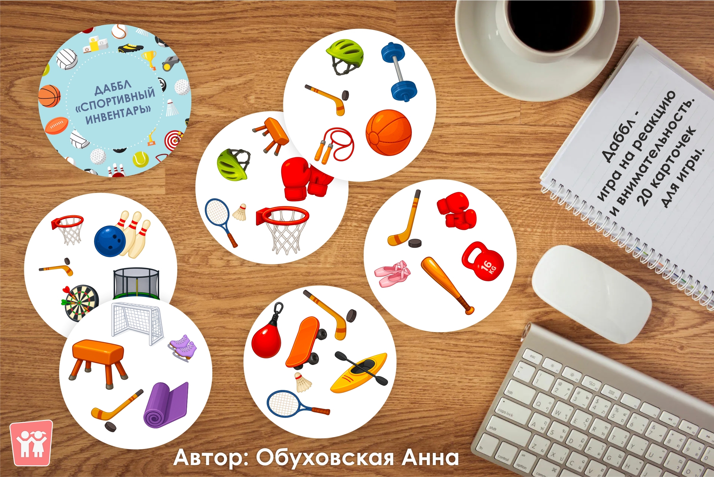 В комплекте 20 карточек. На каждой карточке по 5 изображений. 21 изображение разного спортивного инвентаря.