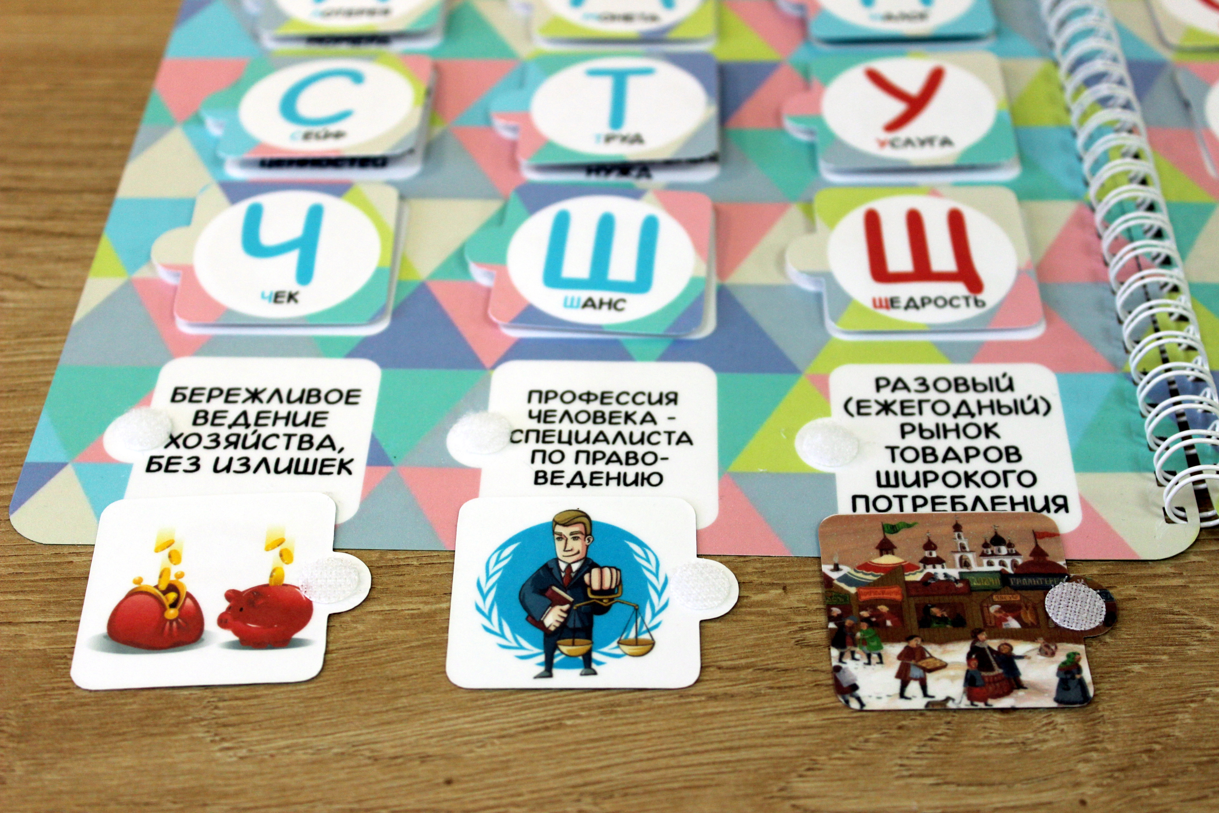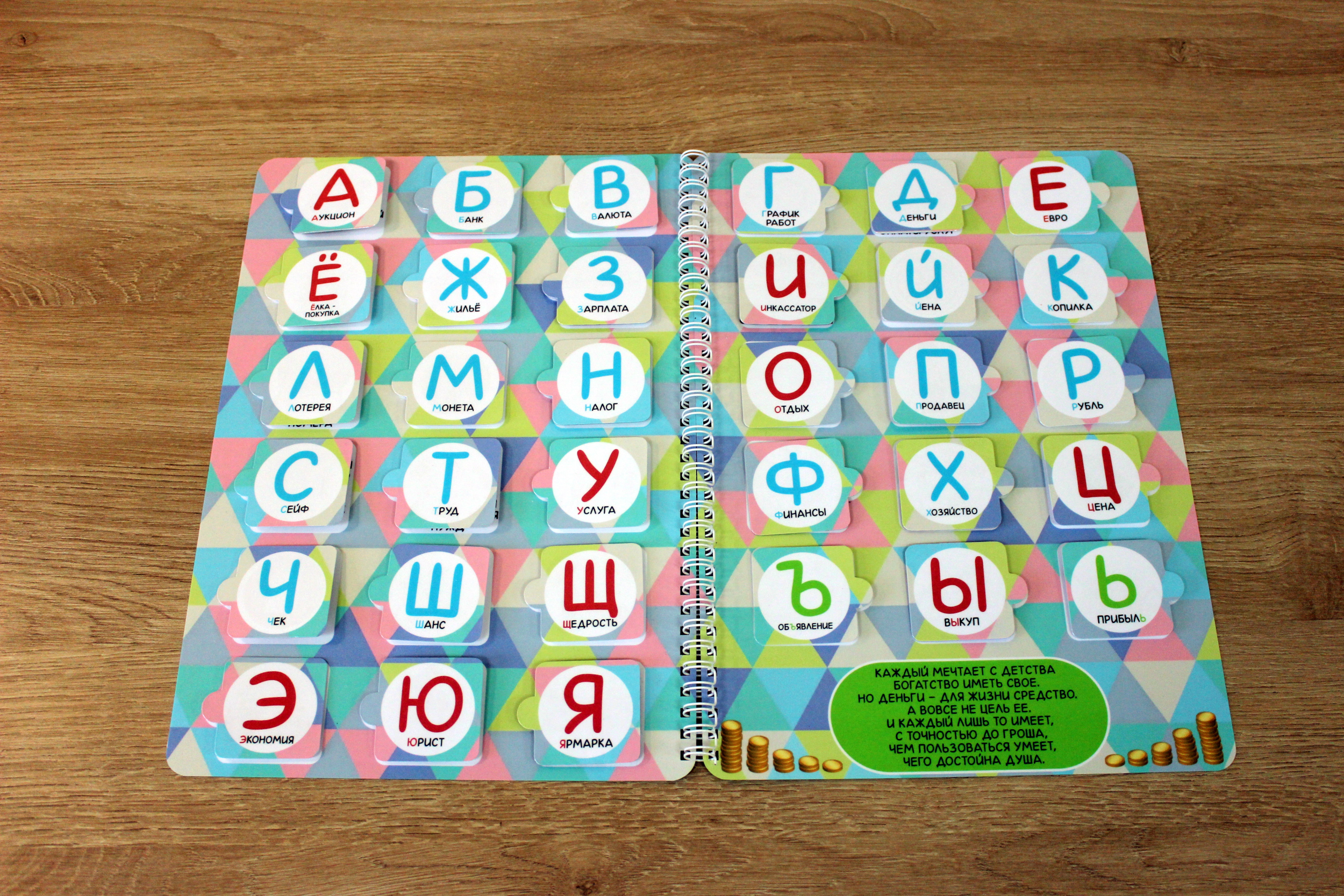 На каждой букве азбуки - финансовый термин, на обороте его символичное изображение, а на поле под буквой - определение.