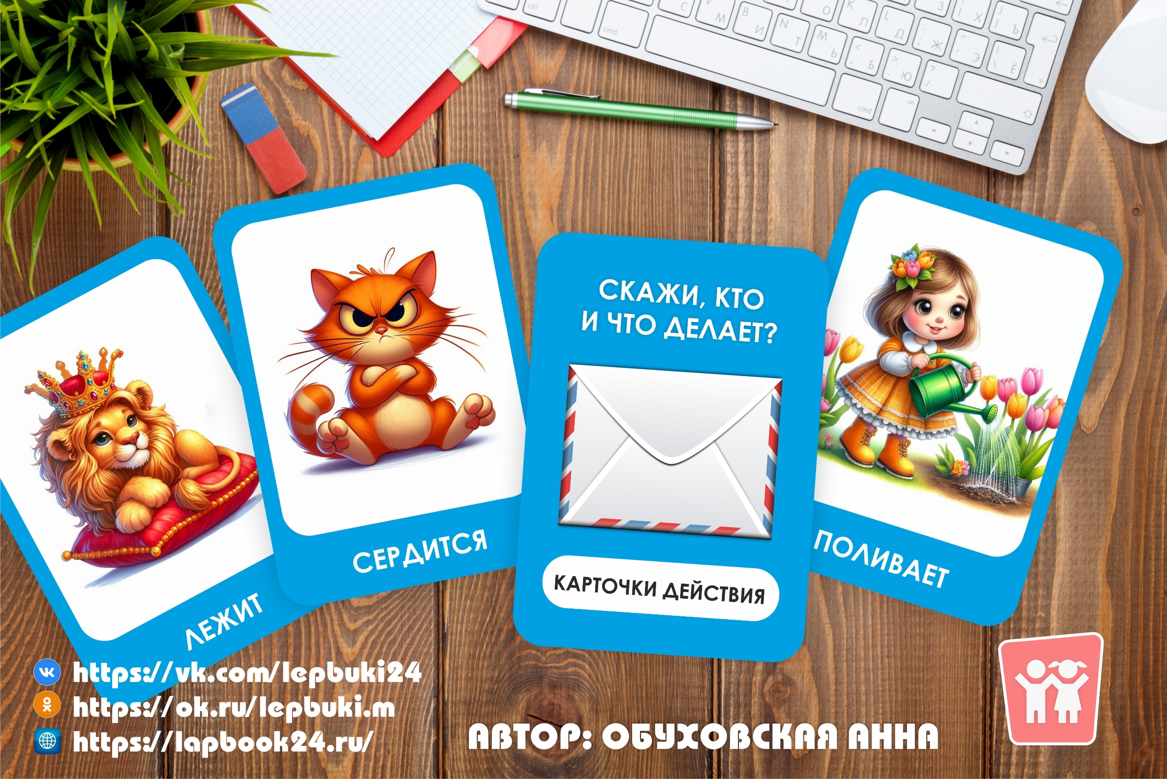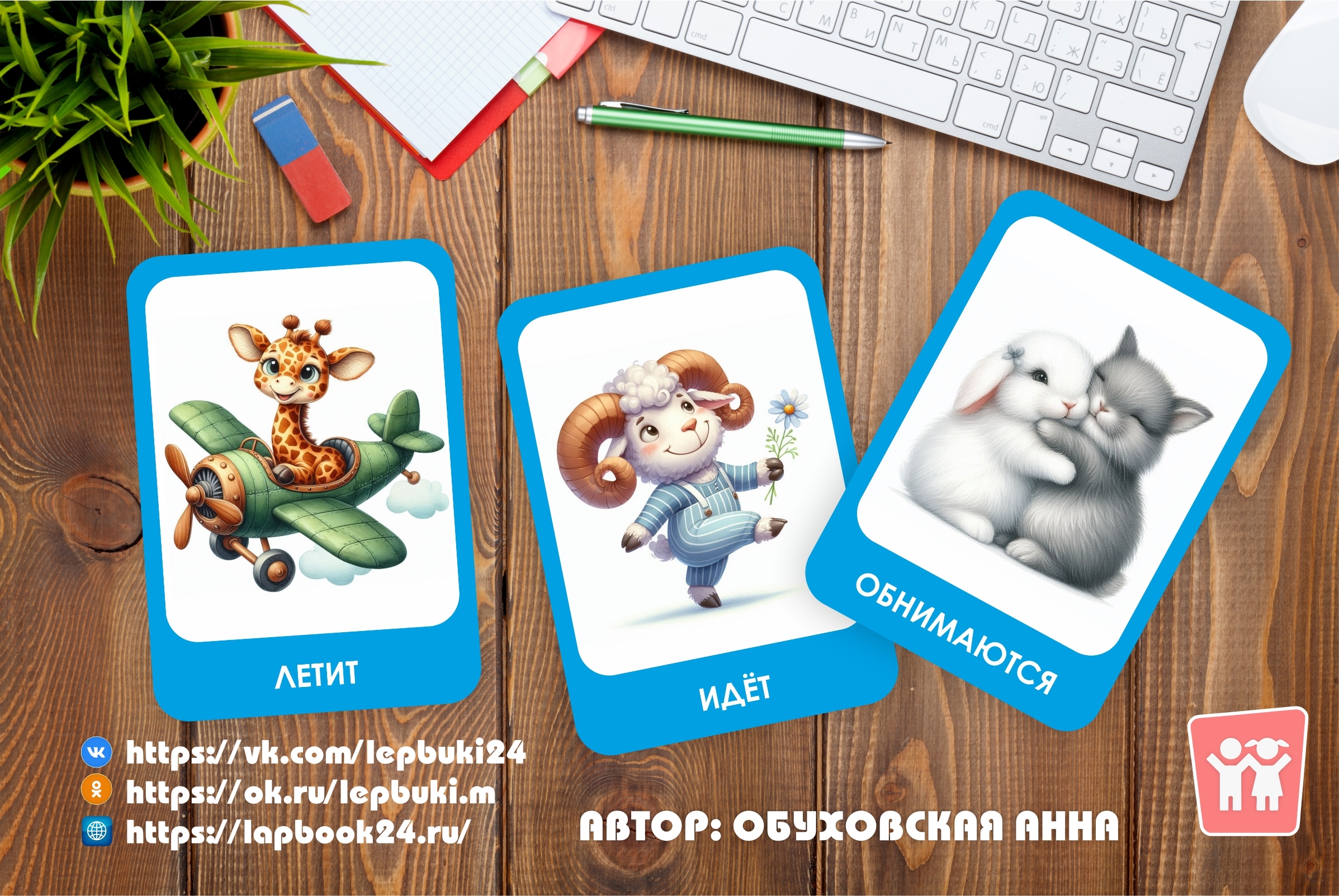 Рассмотрев и обсудив изображения на карточках, Вы закрепите с детьми представления о таких действиях, как: рисовать, смеяться, сидеть, выглядывать, строить, идти, танцевать, лежать, спать, сердиться, плыть, тушить, обниматься, мыть, охранять, лететь, поливать, лежать, играть, дарить.
