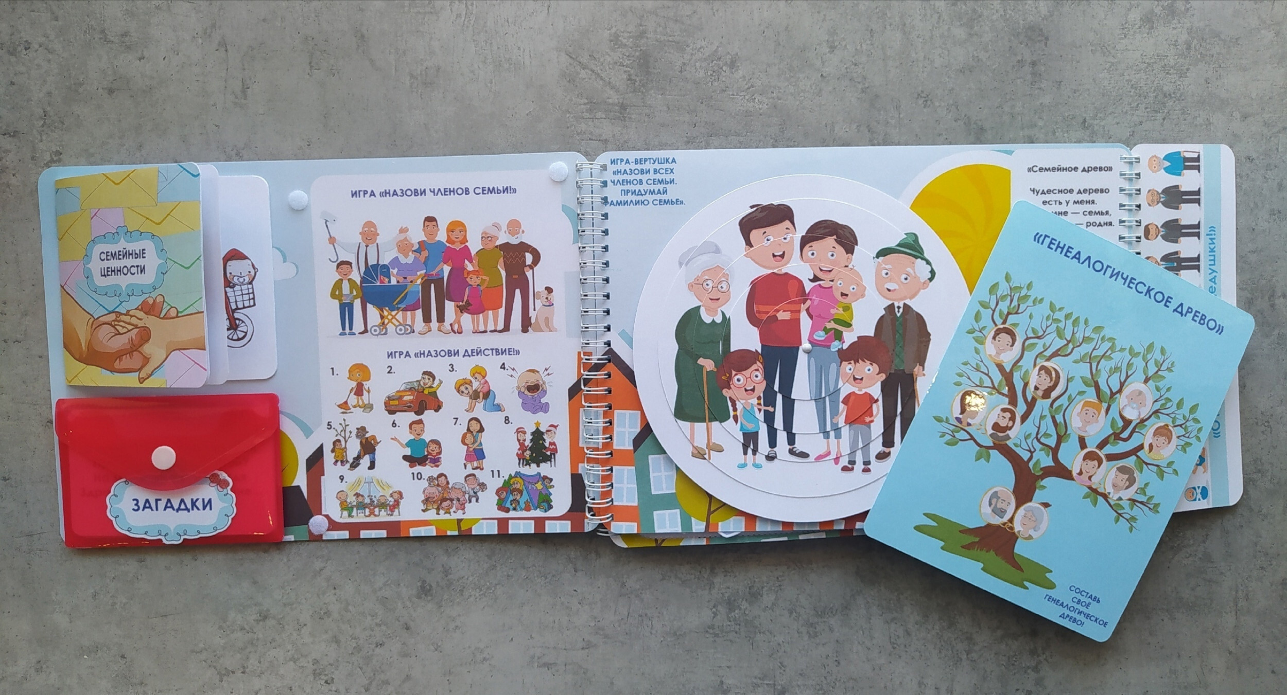 Яркое, эргономичное, познавательное, объемное пособие в игровой форме раскроет содержание темы "Семья". Играя, дети познакомятся с семейными традициями, ценностями, генеалогическом древом; попрактикуются в составлении рассказов с опорой на картинку, в счете, разгадывании ребусов и загадок, прохождении лабиринтов, раскрашивании и это еще не все!