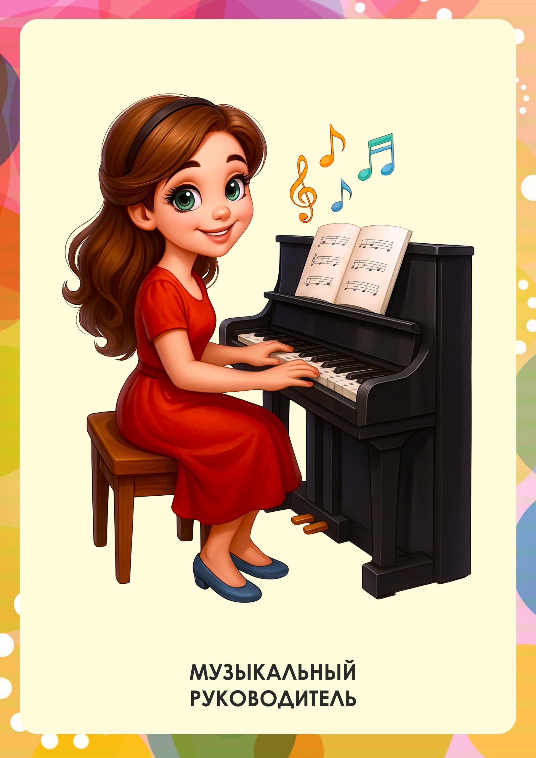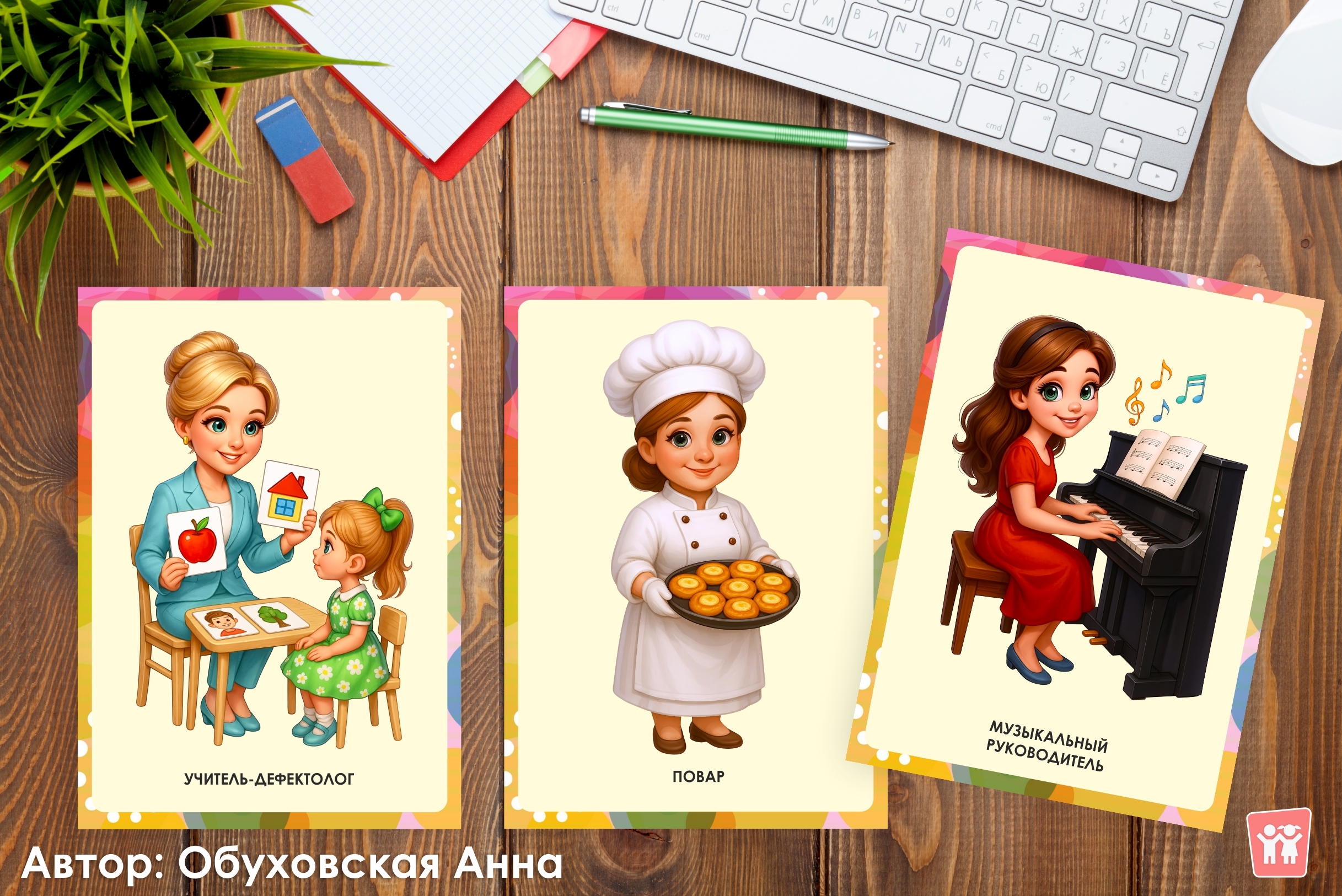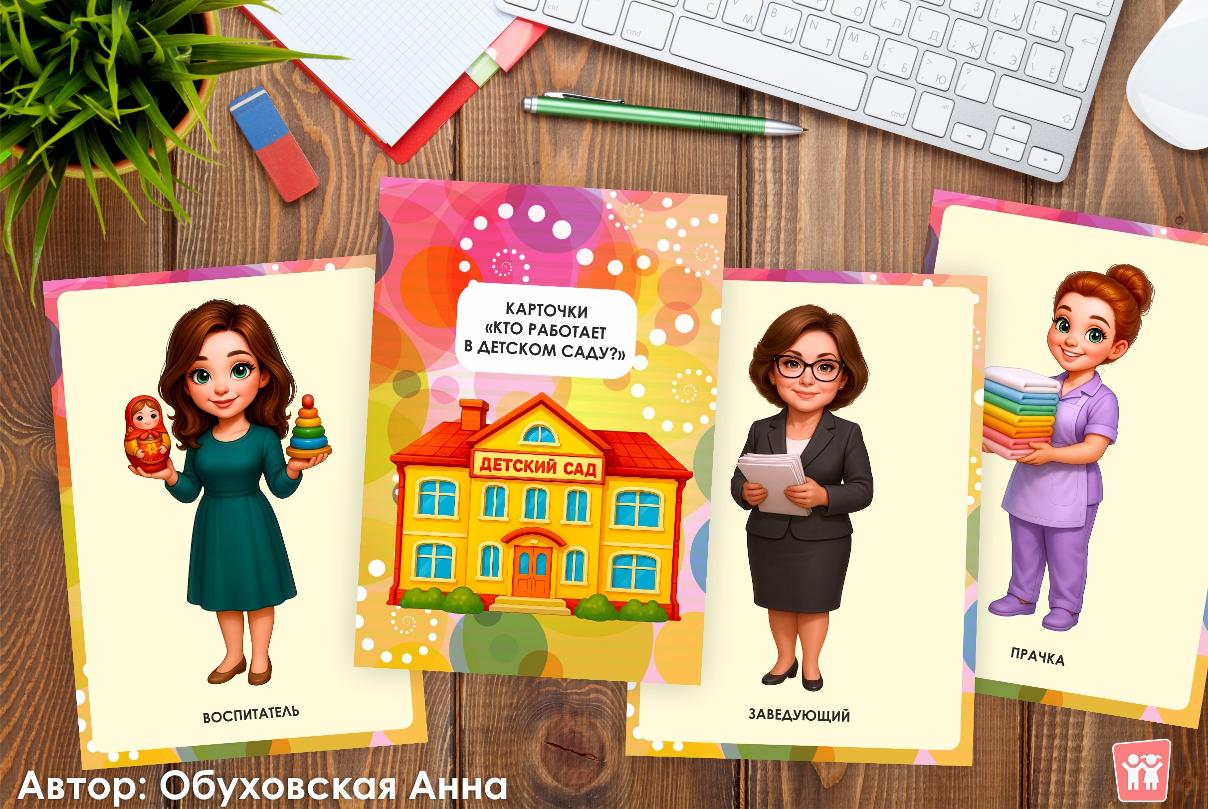 - 18 карточек с изображениями работников детского сада: заведующий, завхоз, старший воспитатель, методист, воспитатель, младший воспитатель, повар, уборщик служебных помещений, учитель-логопед, учитель-дефектолог, инструктор по физической культуре, прачка, рабочий по стирке и ремонту белья, медсестра, музыкальный руководитель, охранник, дворник, рабочий по комплексному обслуживанию здания.