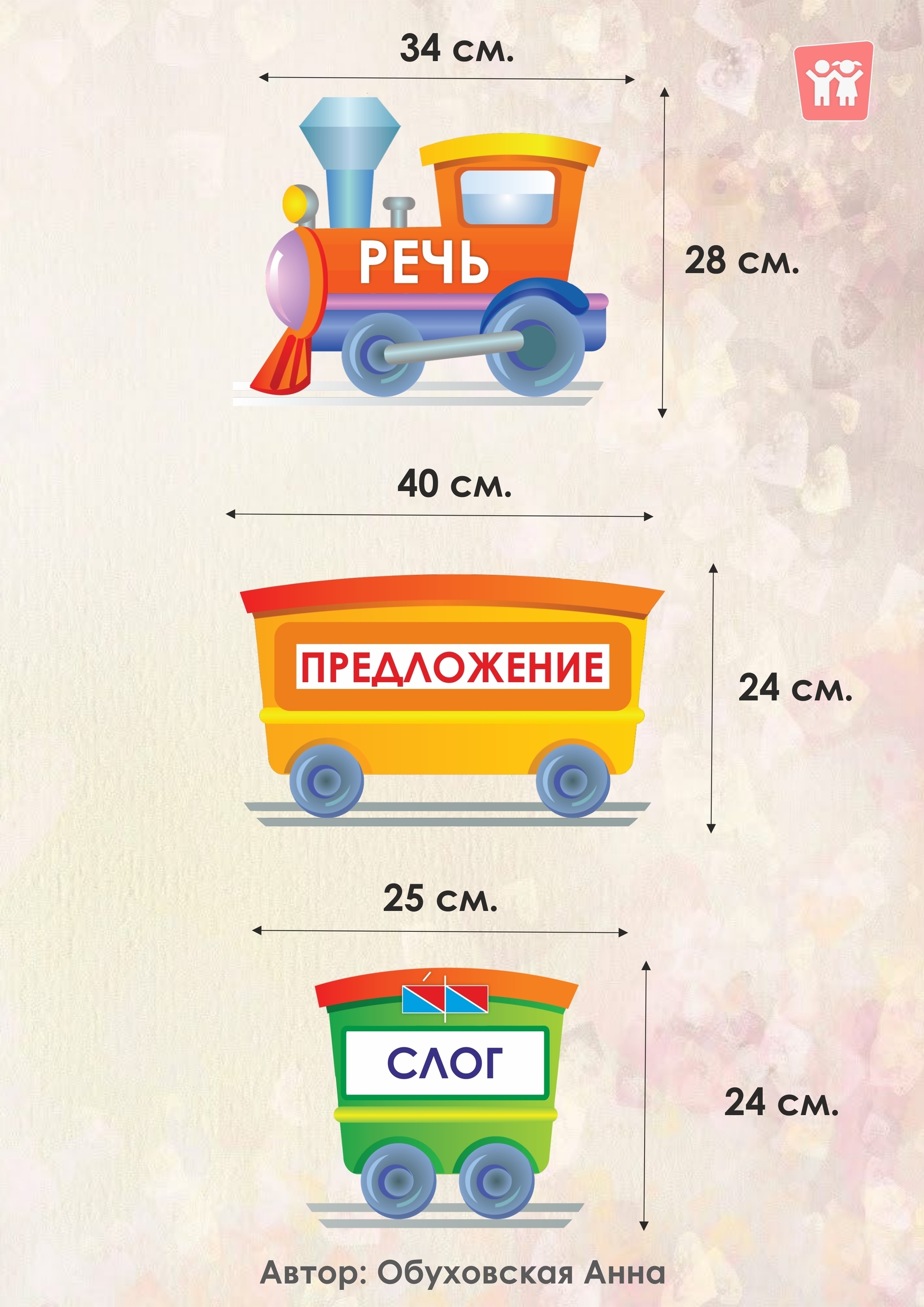 Размер композиции на стене зависит от того, насколько близко расположить вагоны друг к другу, вариант как на шаблоне: 2 м. на 42 см. Размер вагона "ПРЕДЛОЖЕНИЕ": 40 х 24 см. Размер остальных вагонов: 25 х 24 см.